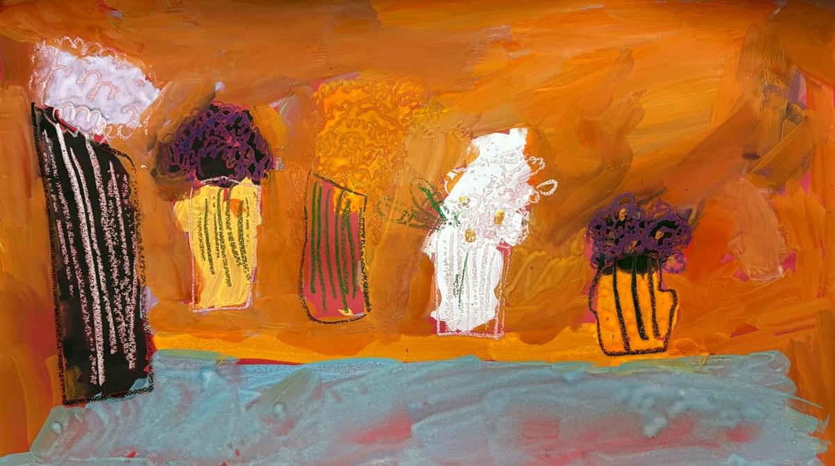 小さな鉢植えの花をいくつかならべてあるものを見ながら自分の選んだ色の画用紙にパスで描いて絵の具で彩色します。