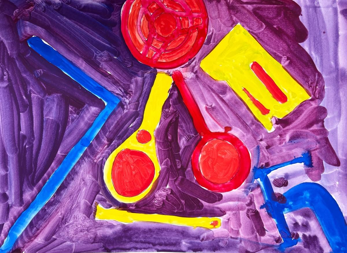 点や線.面.色彩の基本的な課題を通して絵の具の出し方や混色の方法、筆や定規、コンパスの使い方作品を作っていく手順などを学びます。教室では、4才から6年生までが同じ課題をしますが、年齢.経験に応じた言葉や用具をステップを踏みながら学ぶのにデザインは適しています。