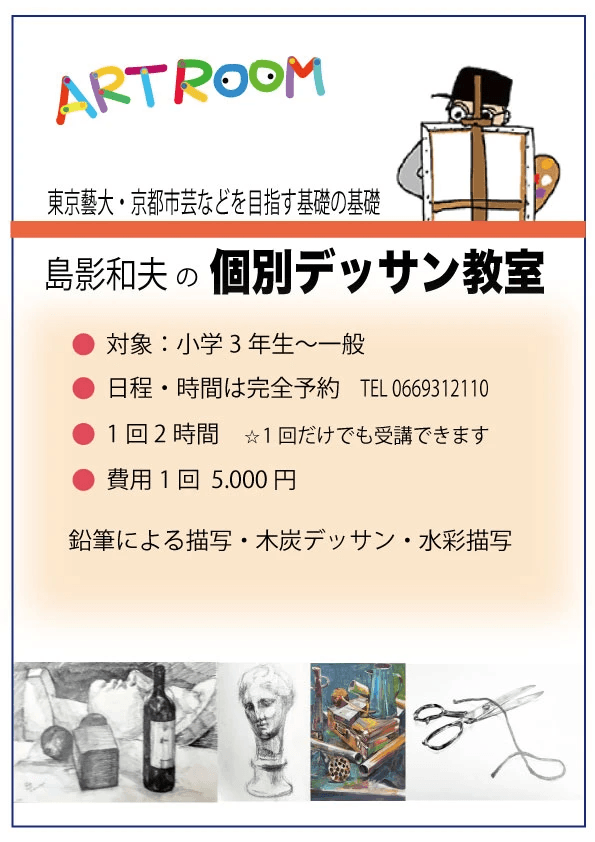 子ども絵画教室アートルームは、大阪教育大学名誉教授(東京藝術大学美術学部卒)島影和夫が毎回異なった課題を作成し4才から6年生までが「たてわりクラス」で学ぶ絵画教室です。様々な造形活動を通して自ら積極的に考え、秩序立てて完成させて行く力をつけます。年齢・経験の異なった子どもたちの絵や工作を比べたり、賞を取るために展覧会等に出品することもありません。図画・工作から他の教科へ関連を付けて学びます
