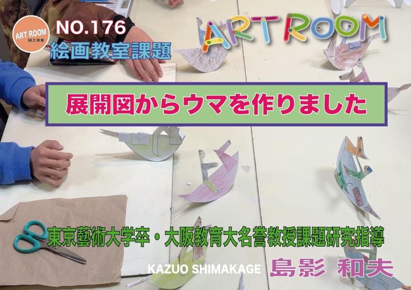 図画・工作は一人ひとりの子どもの個性・独創性を大切にする教科です。アートルームは、大阪教育大学名誉教授(東京藝術大学美術学部卒)島影和夫が毎回異なった課題を作成し4才から6年生までが「たてわりクラス」で学ぶ絵画教室です。様々な造形活動を通して自ら積極的に考え、秩序立てて完成させて行く力をつけます。年齢・経験の異なった子どもたちの絵や工作を比べたり、賞を取るために展覧会等に出品することもありません。図画・工作から他の教科へ関連を付けて学びます